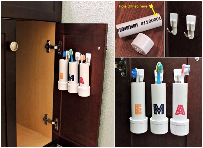 Sau khi sử dụng hết phần lõi của chai nhựa, thay vì bỏ nó đi thì bạn có thể tái chế nó thành một hộp đựng bàn chải đánh răng nhiều ngăn như thế này. Cách làm khá đơn giản khi bạn chỉ cần khoét phần lõi giữa của nó để làm ngăn rồi gắn phần nắp chai lên là được. Cách làm này vừa không tốn nhiều kinh phí lại nhanh, gọn, lẹ nữa.