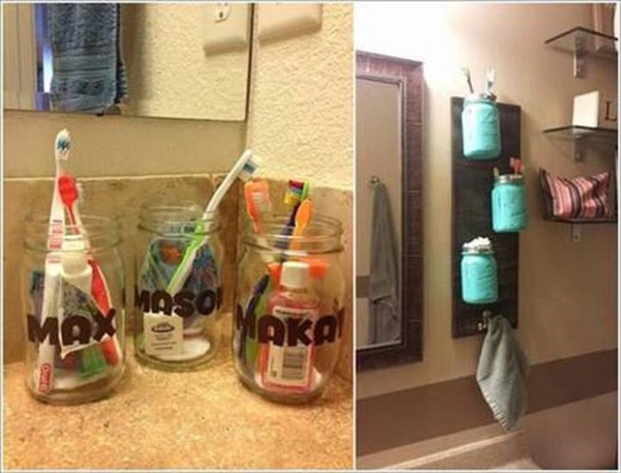 Nhiều người cứ thường lầm tưởng rằng những chiếc hộp thủy tinh chỉ có thể dùng để đựng và cất giữ các loại gia, vật liệu trong nhà bếp thôi. Điều đó là hoàn toàn không đúng. Với những chai thủy tinh dưới đây chúng ta vẫn hoàn toàn có thể dùng để cất giữ các bàn chải đánh răng và kem đánh răng được. Không những thế chất liệu thủy tinh trong suốt còn giúp bạn thỏa sức sáng tạo những hình thù trang trí bên ngoài nữa đấy.